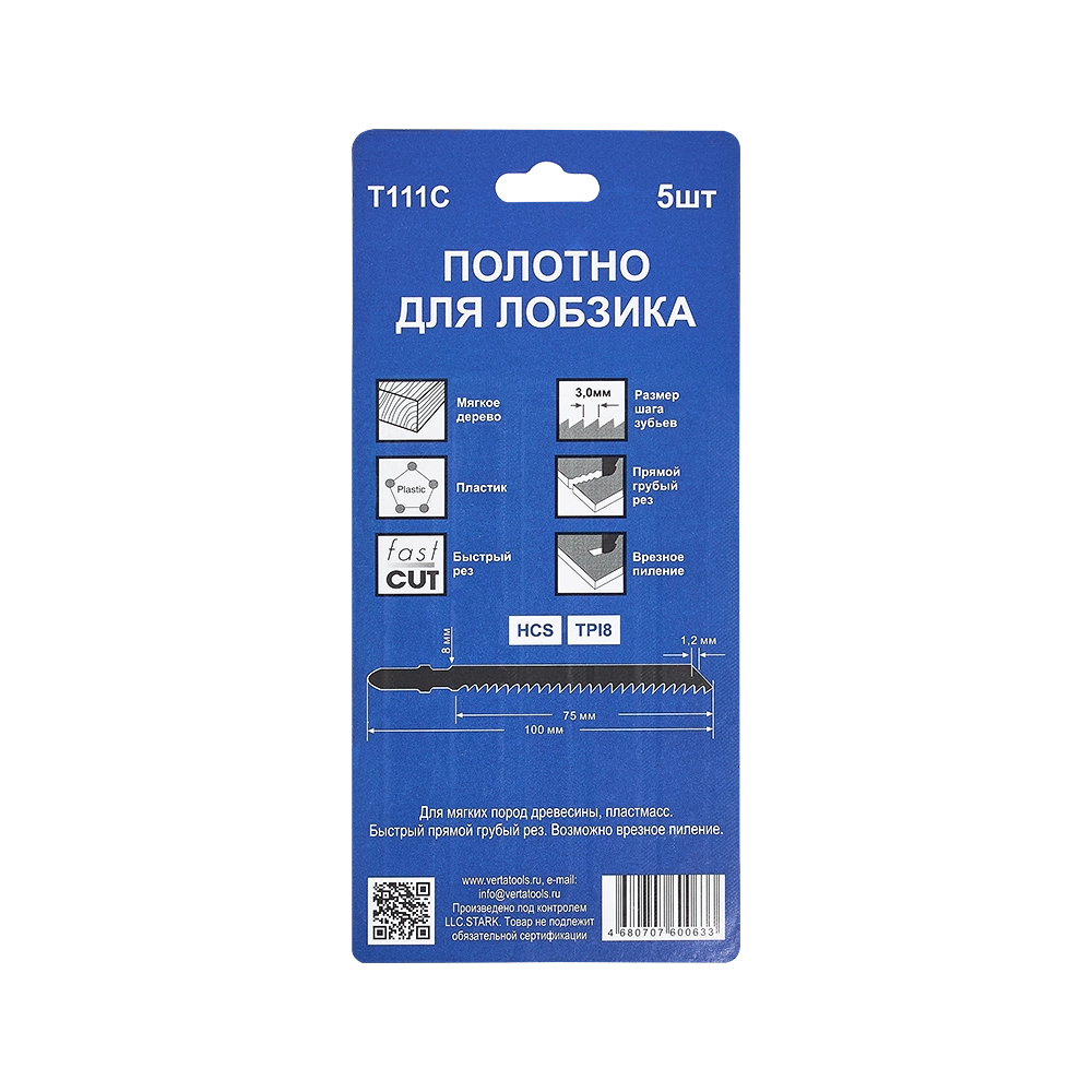 Полотно для лобзика по мягкому дереву и пластмассе T111C (5шт) VERTA